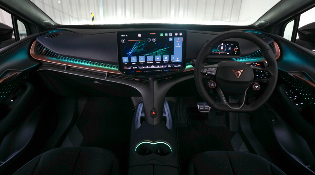 That creative spark has brought Cupra’s own version of the Northern Lights into the cabin. The door trims are covered in tiny LEDs, yes those devils are at it again, mated with a beautiful lightshow across the dashboard with a choice of five soft colours, obviously best seen at night.