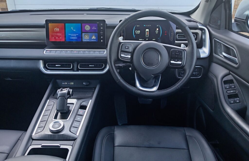 Right, GWM is Chinese so you think I’m going to be moaning again about everything going through a touchscreen. Yes there is a 12.3in screen but the Poer has switches, a whole bank of them below the screen giving quick access to fan speed, heating, heated back window, and heated seats and hill descent, and there is a button on the steering wheel to turn off lane assist. All very welcome and sensible.