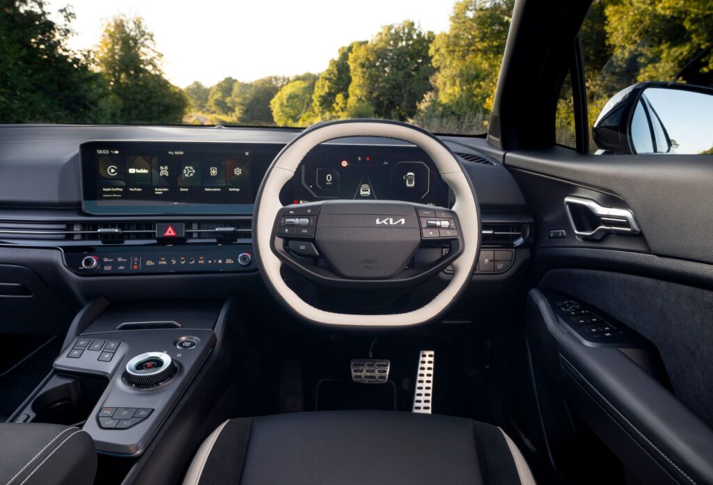 The Sportage cabin is a joy. The dashboard layout looks special with a curved widescreen unit split into two 12.3in digital screens, one for infotainment, the other the driver’s binnacle with a choice of displays.